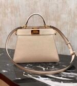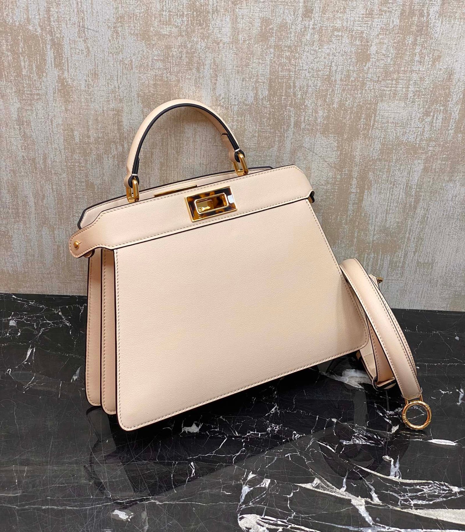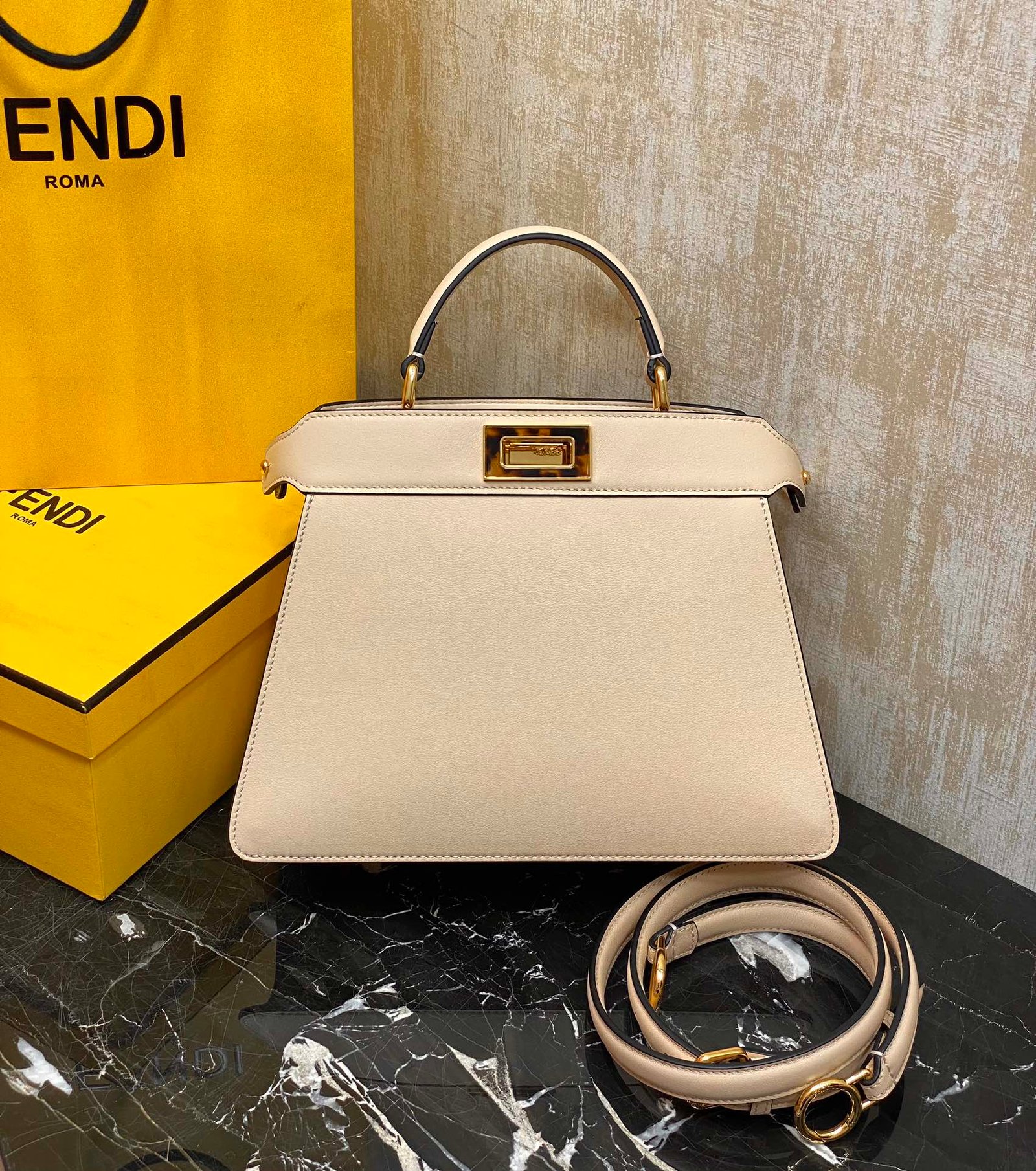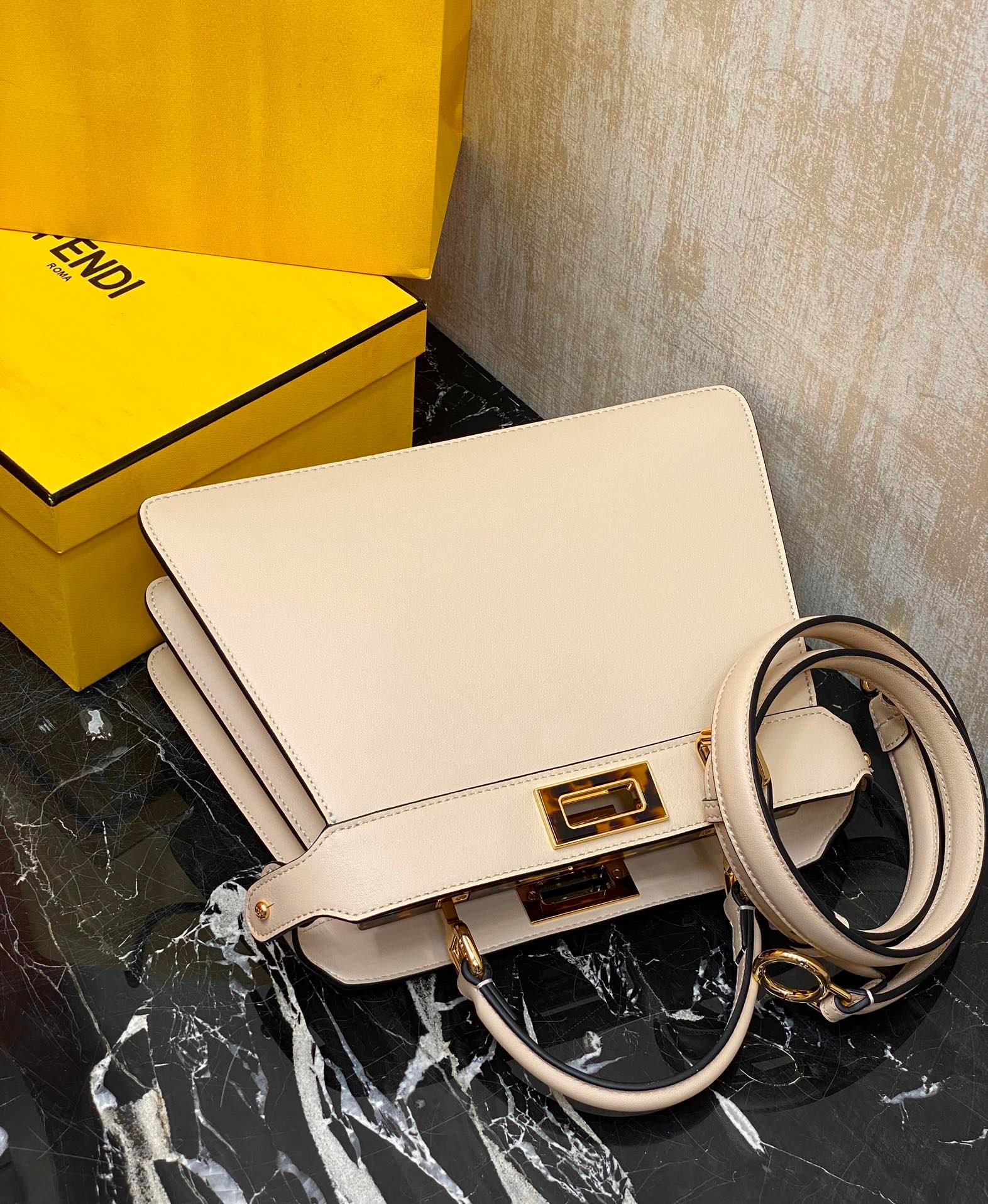 Home BAGS FENDI PeekabooISeeU medium handbag in calfskin leather, embellished with a classic twist lock on both sides, lined in soft nappa leather, with two compartments separated by a rigid divider, featuring a tie closure internal pocket and tortoiseshell and amber metal pieces. The bag comes with handles and an adjustable, detachable shoulder strap with a tortoiseshell buckle for a sophisticated and durable looknSize: 27*9.5*21cmnNo. 327Tortoiseshell and amber hardwaren