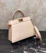 With a full set of counter packaging n apricot color nPeekaboo Xs small handbag system, handbag, irreplaceable classic temperament, young fashion versatile, small bag with large capacity, star netroots with the same models, recommended, original price of 2W +, take inside and outside the washed lambskin, super fine, soft, breathable and comfortable. There are each two compartments, the center is separated by a rigid plate. Twist lock on both sides. Single handle and lining. Adjustable and removable chain shoulder strap, can be carried over the shoulder or diagonally. Size 19*8.5*15.5cm 🐝🐝309 sheepskin