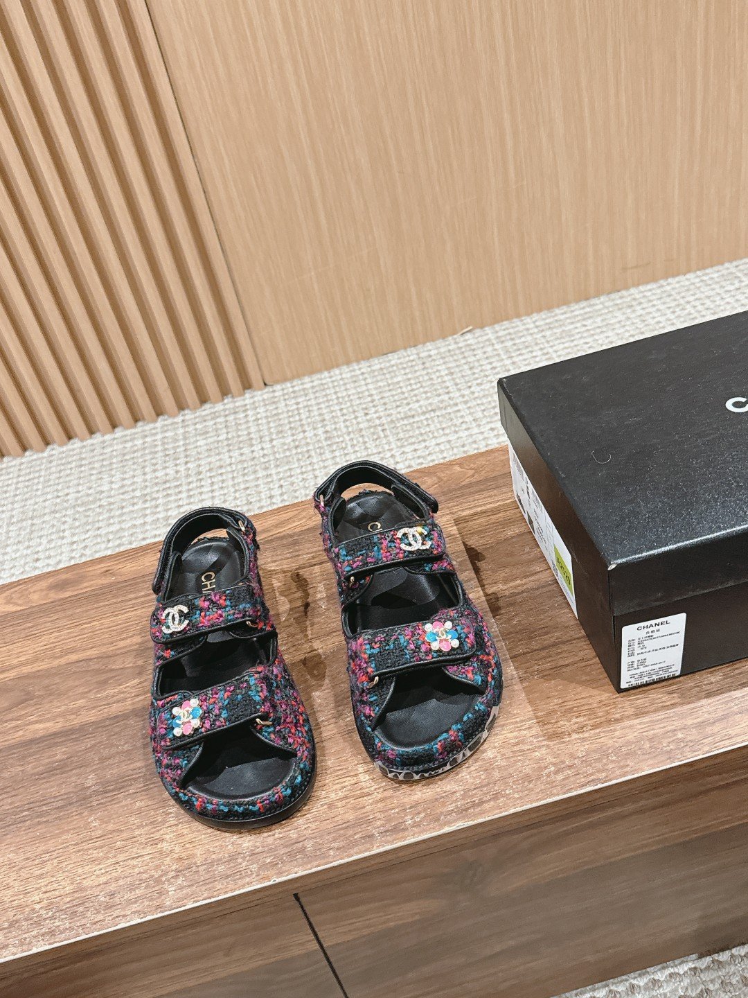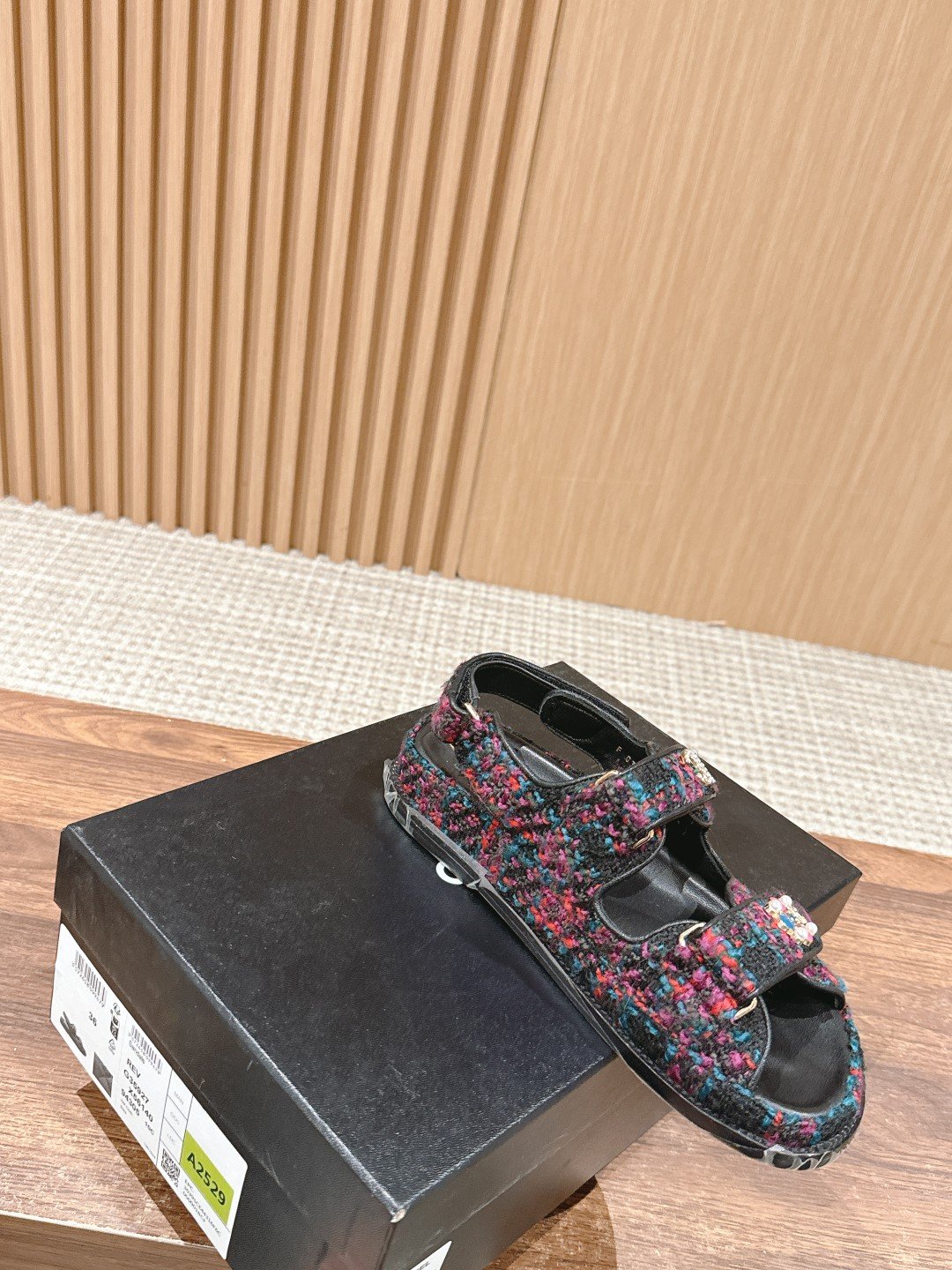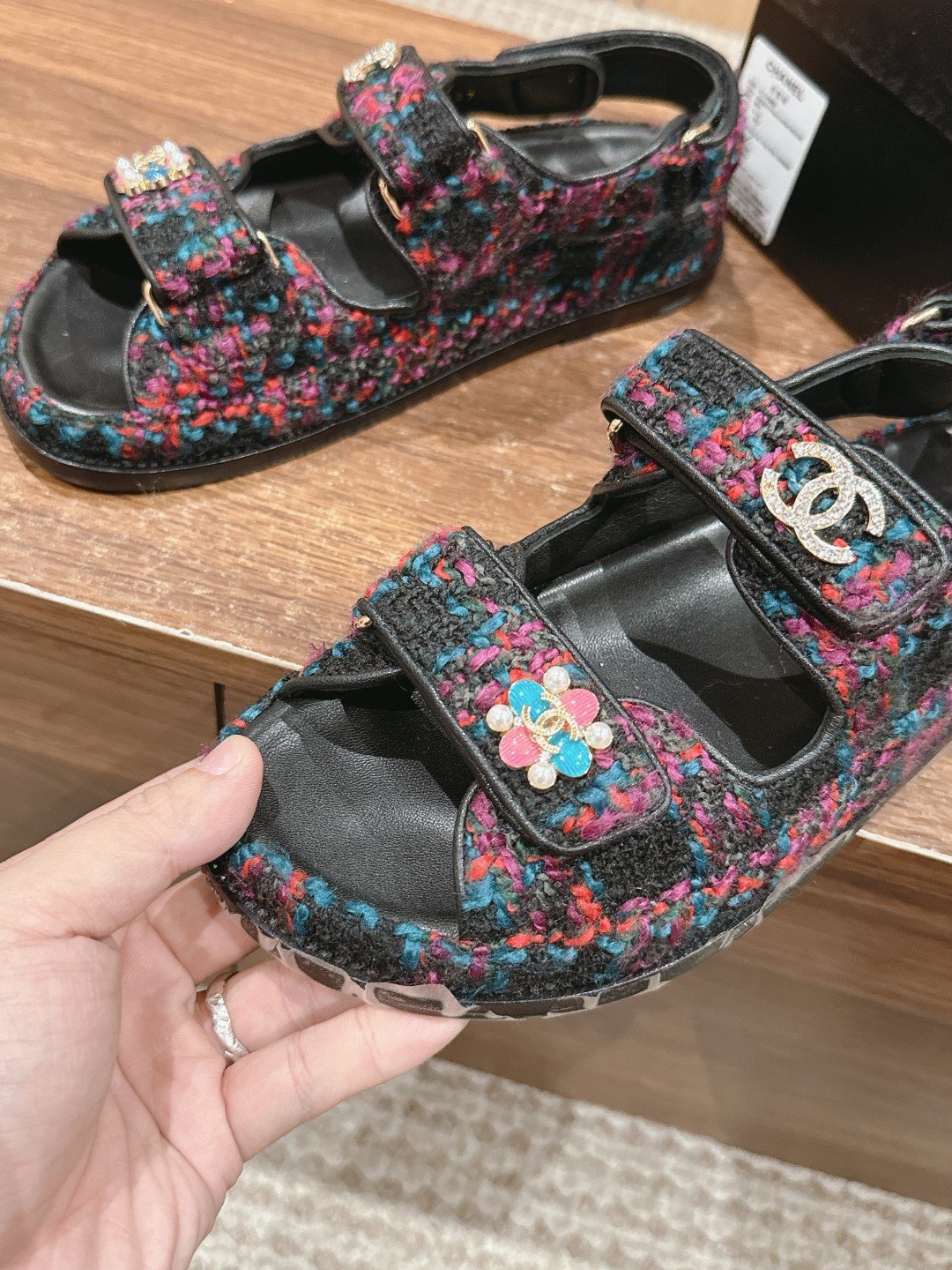 [Upgraded] 𝐂𝐇𝐀𝐍𝐄𝐋 Chanel Classic Velcro Beach Sandals n🔥 Every year, Grandma Chanel’s classic Velcro series of hot items will always appear! The blingbling velcro are all sparkling, classic double 𝐂 accessorized design, a treasure sandal worth getting! nnExcellent craftsmanship, customized original lambskin, cowhide sheepskin Sheepskin Special materials Cowboys Tweed, nThree-layer handmade leather outsole imported from Italy Genuine leather along the stripes edge nnSize: 35-39 (40 customized non-returnable)n