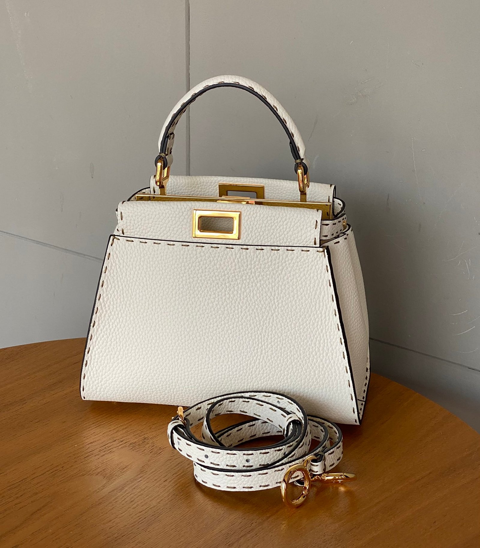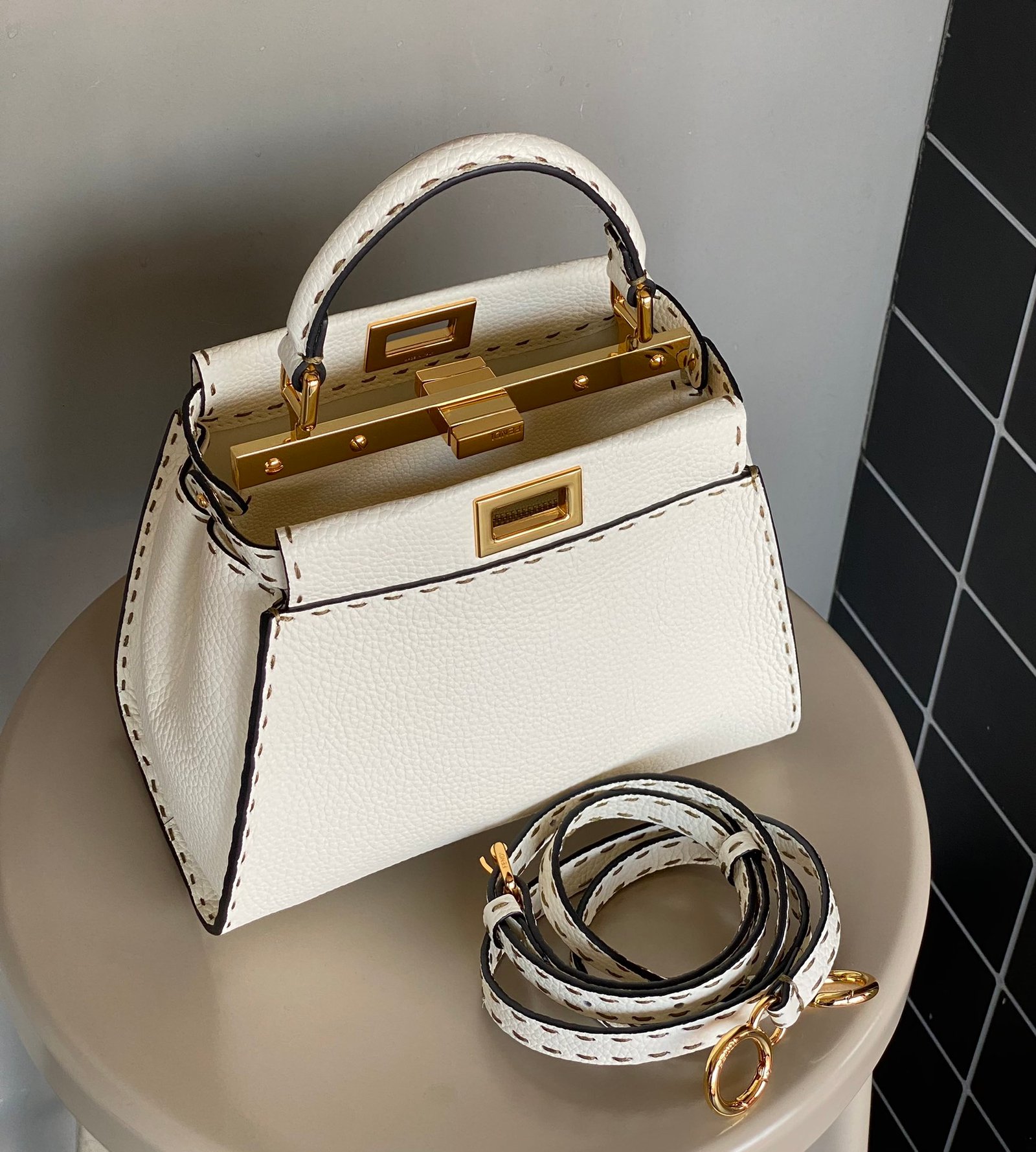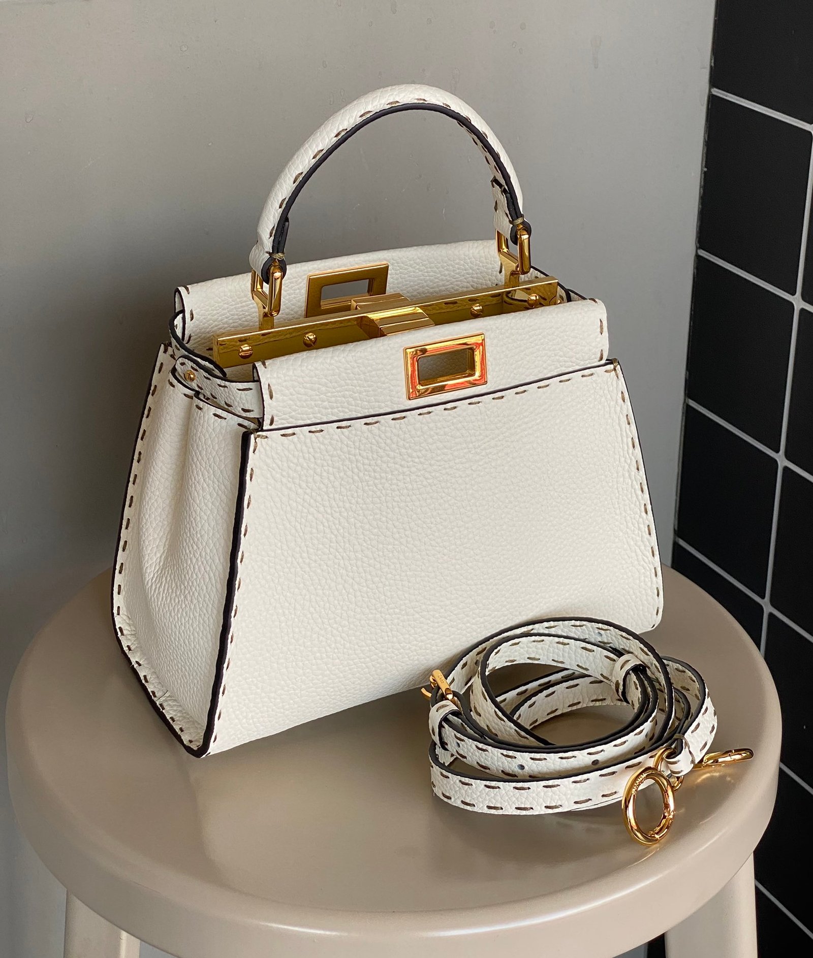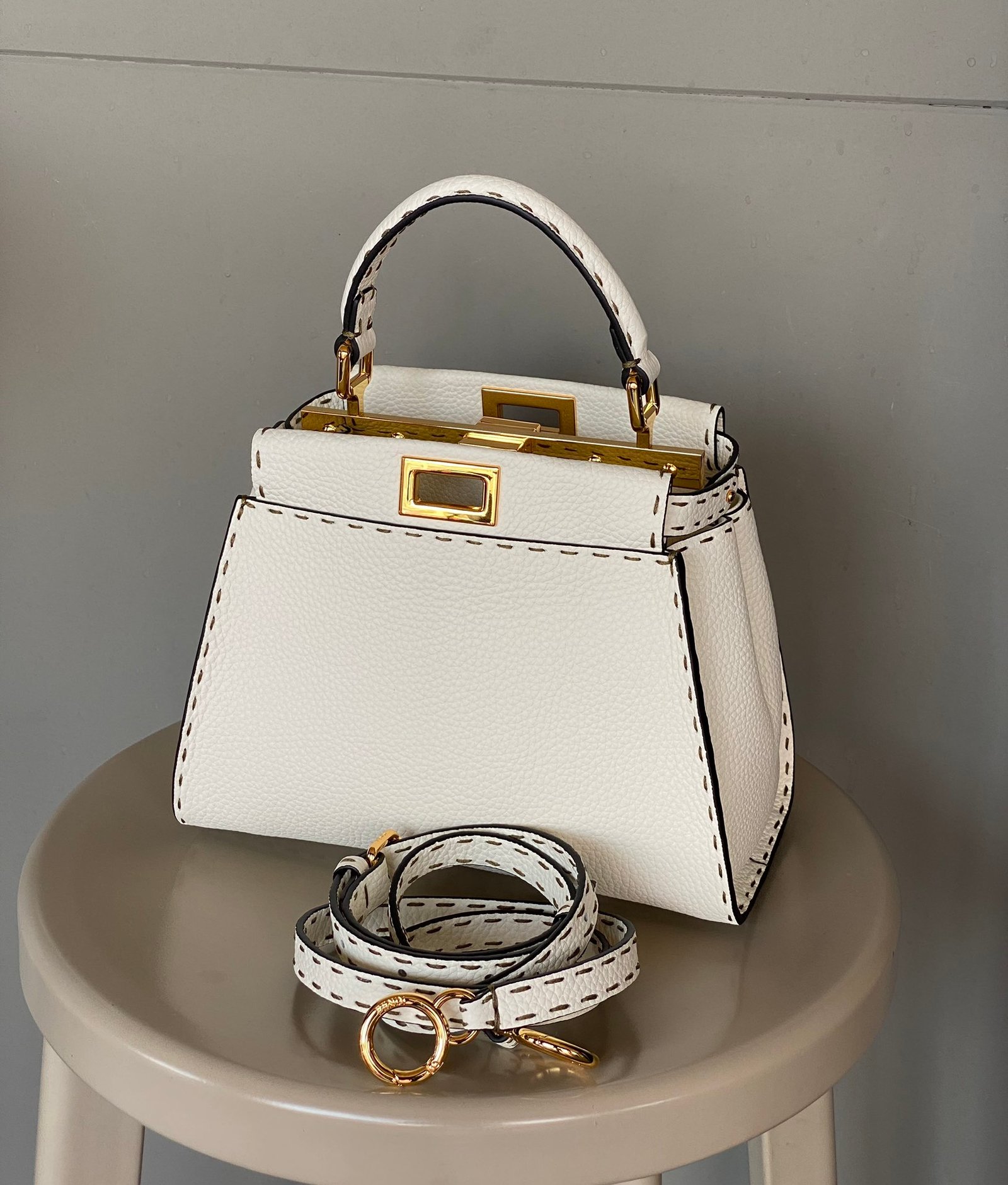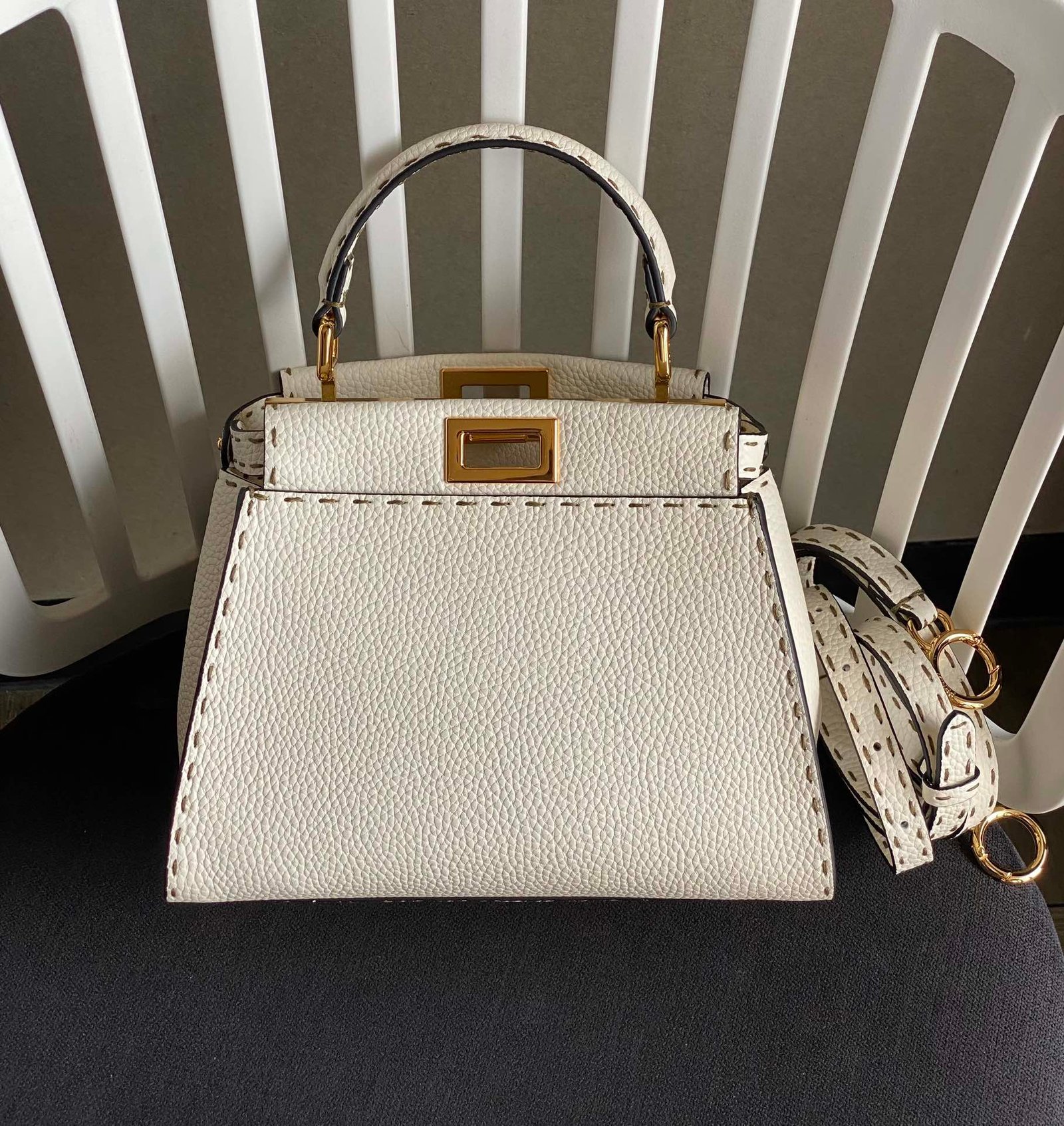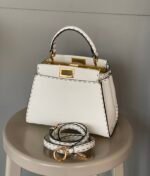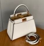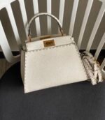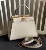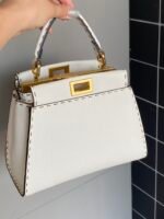 FENDIPeekaboo, white is probably a year-round, never out of fashion color, Lychee Roman calfskin outer stitching, want to low-key Chinese and not lose the sense of sophistication, with a strap can be hand-carried shoulder or crossbody trapezoidal bag body + white color, classic and atmospheric, the size of the day just to meet the daily use of cell phones, lipstick, powder, and so on in the matter of words, it is very suitable for the summer to wear! Small skirt with it~
