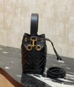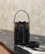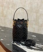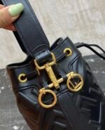 the latest model, Mon Tresor small bucket bag, in lambskin leather, fully decorated with FF pattern, with lined interior, with gold finish metal parts. One long and one short two removable shoulder straps, can be carried on one shoulder or crossbody.
